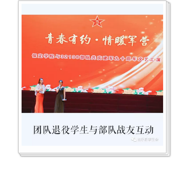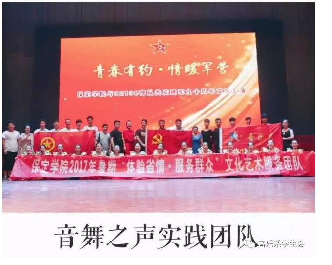 在“八一”建军节来临之际,为庆祝中国人民解放军建军九十周年,喜迎党的十九大召开,7月6日,437必赢会员中心音乐系“音舞之声”文艺实践团队走进32138部队进行“青春有约 情暖军营”文艺汇演。学院党委副书记宋书通,学院团委书记郝学武,音乐系主任黄晓钟,副书记张红玉以及部队首长领导参加活动,部队近两千名官兵观看了现场演出,同时进行了另外两个驻地的现场直播。